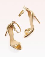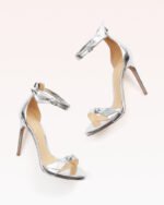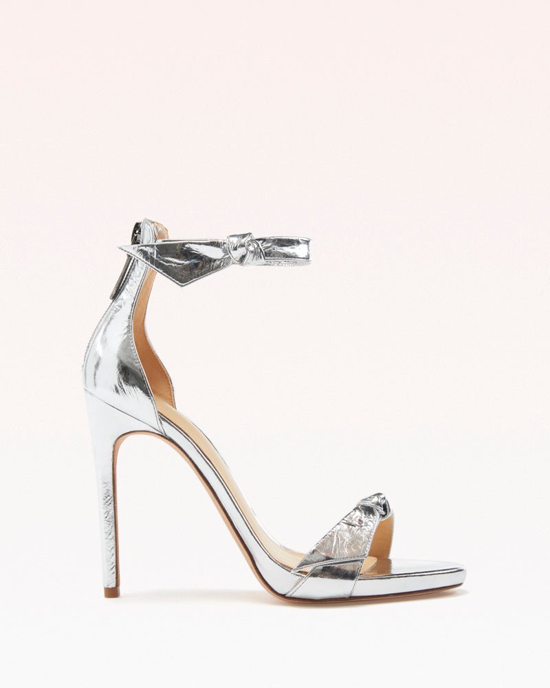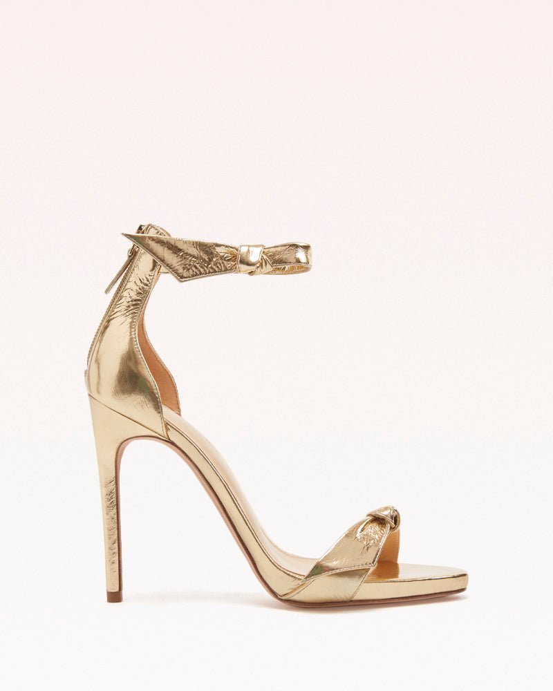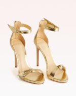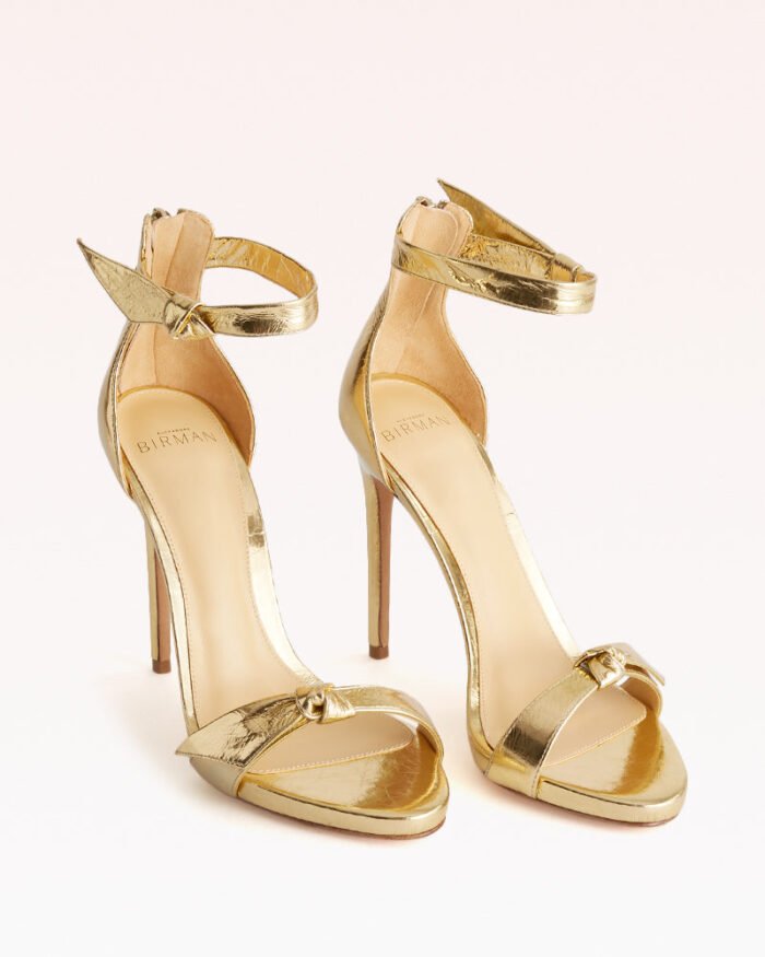 An iconic style in metallic leather. defined by our signature bows. elegant straps and a back zipper.