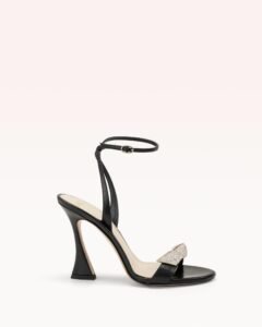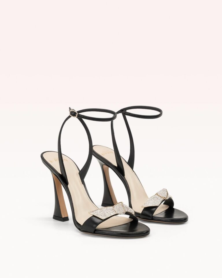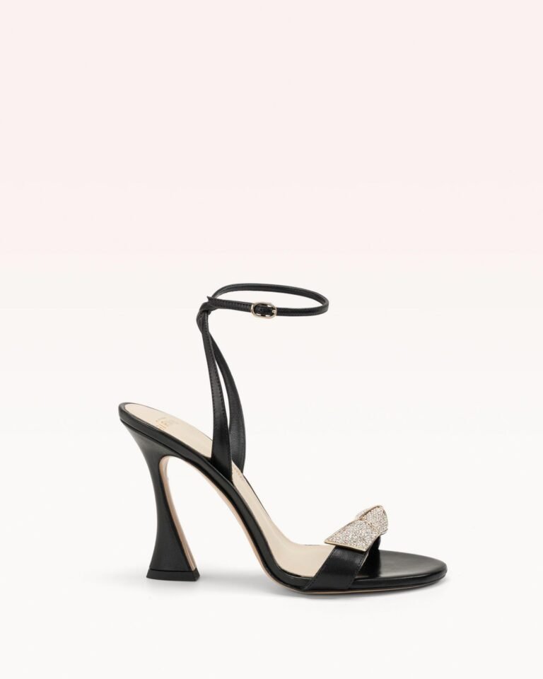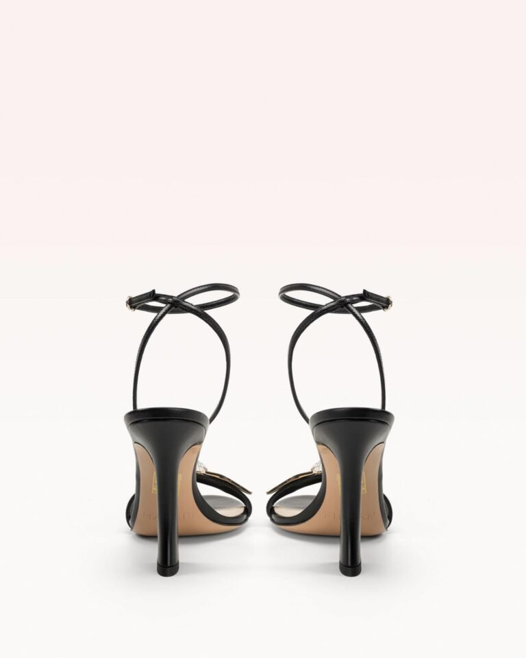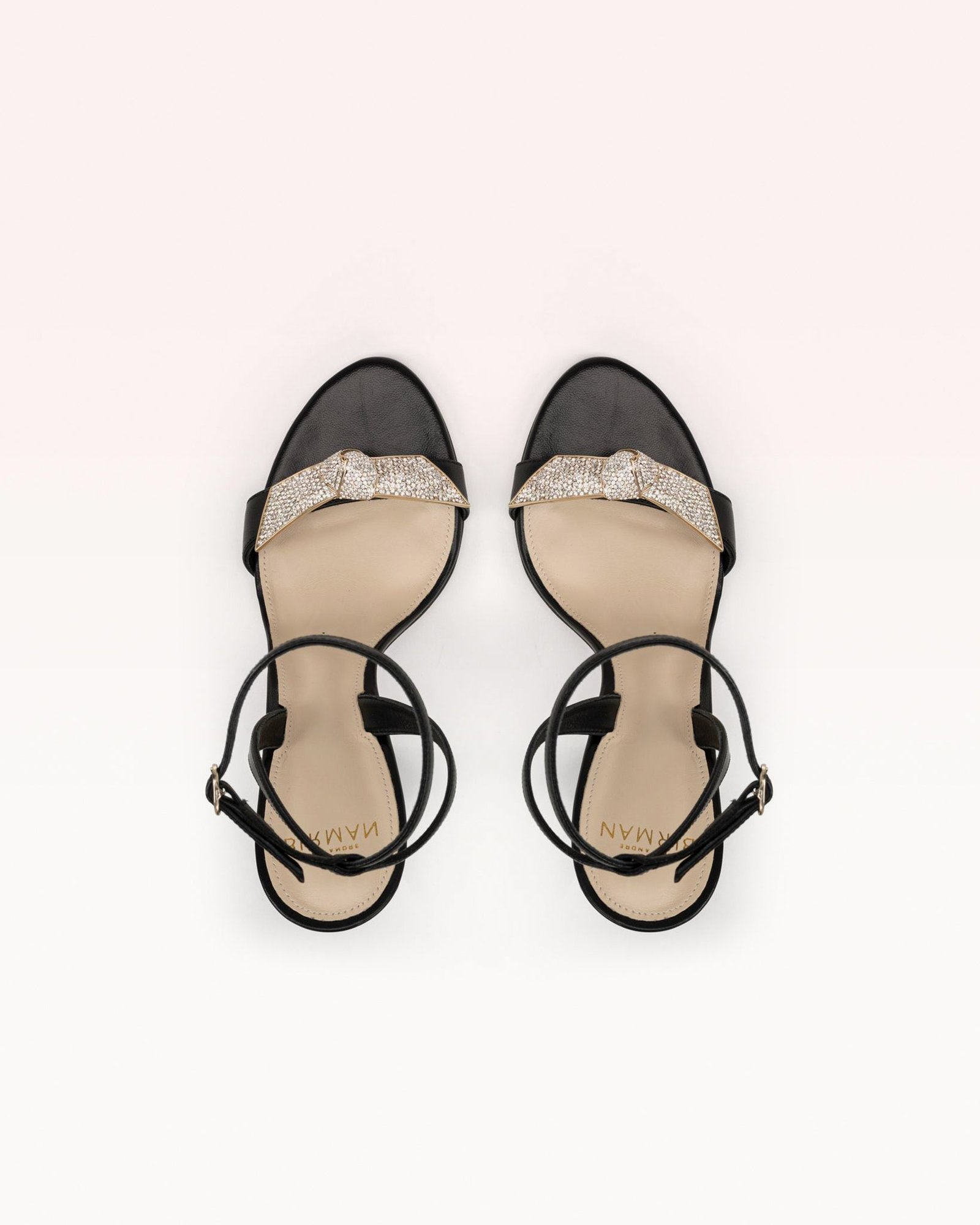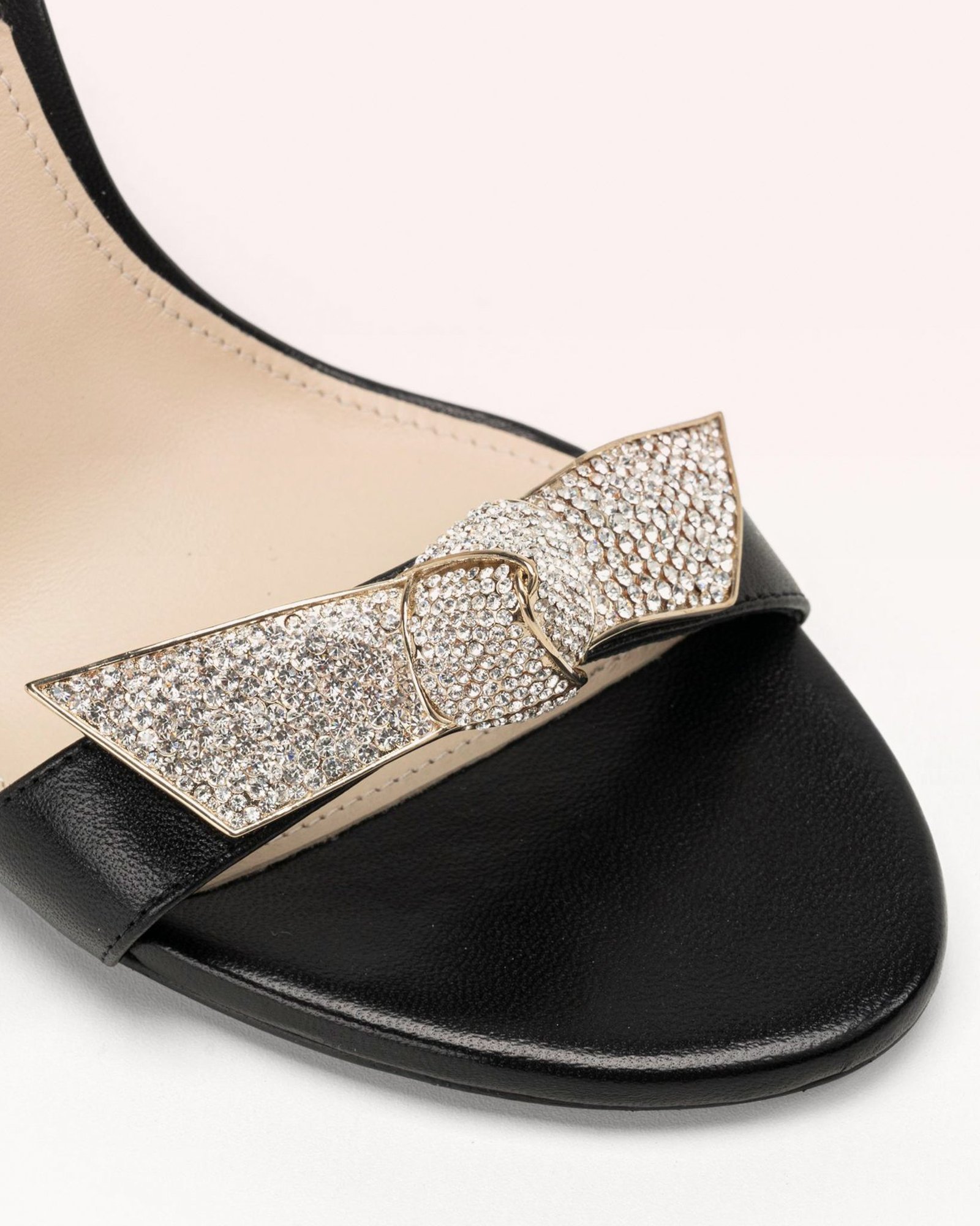 Our Clarita bows just gained two upscale versions this season: entirely made of metal and a glam version in metal adorned with Crystals. Our dazzling Clarita bow is beautifully placed over nappa leather straps. These exquisite styles come in our new showstopper bell heel. Easy to wear and a guaranteed fashion statement.