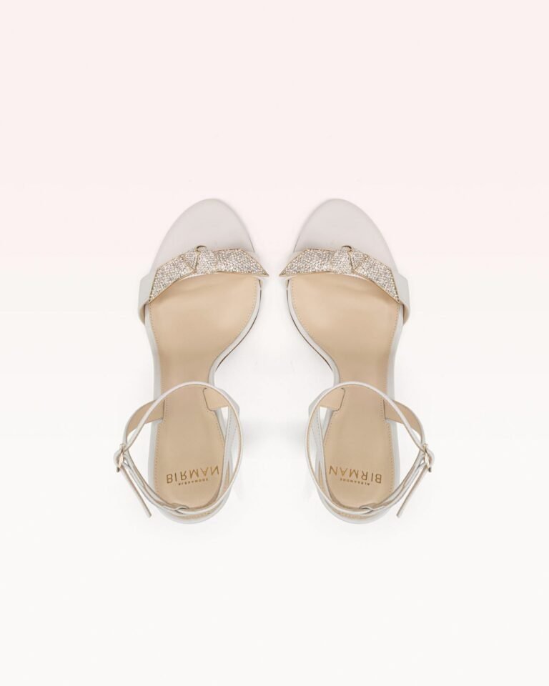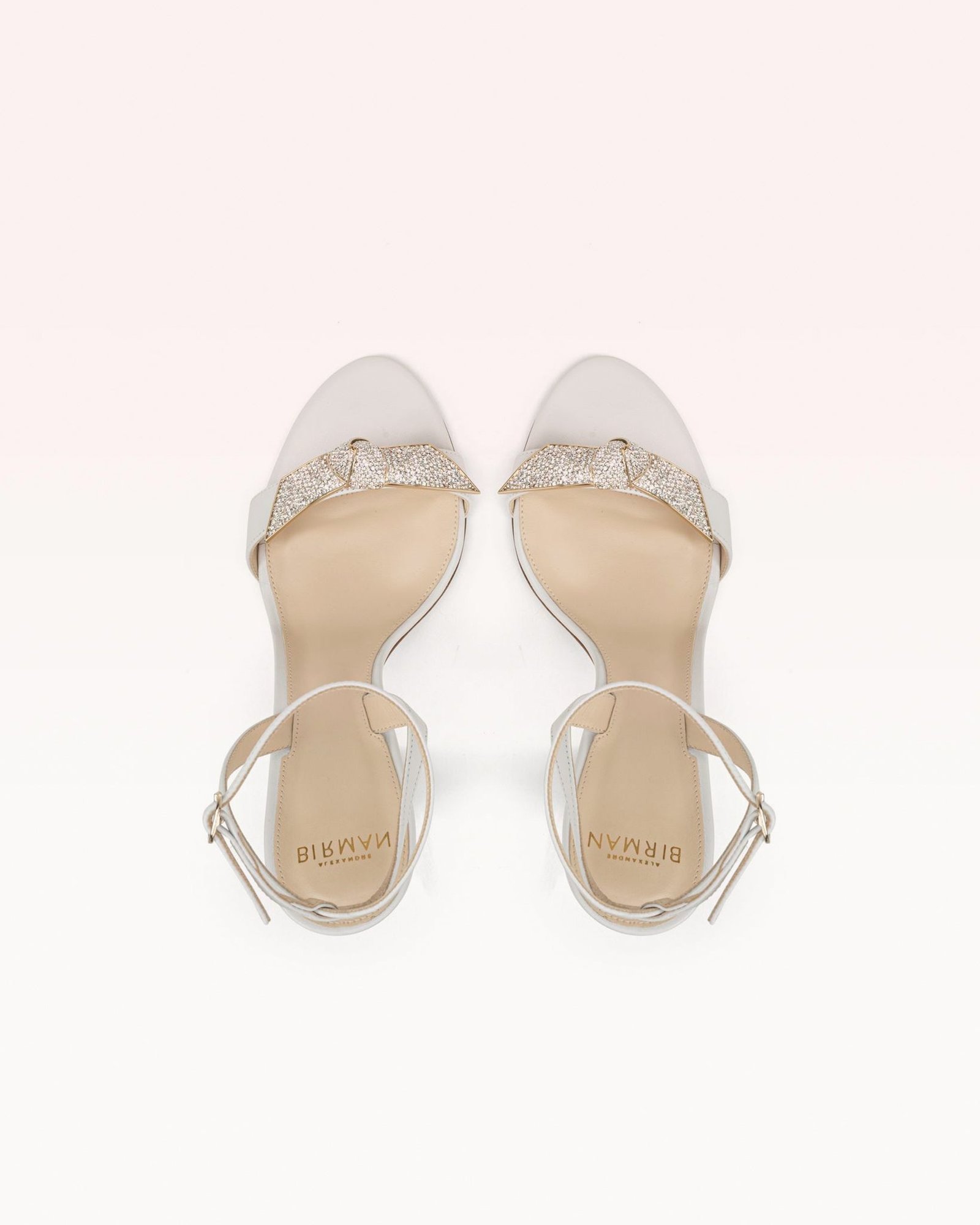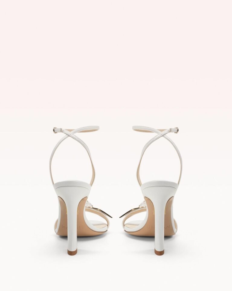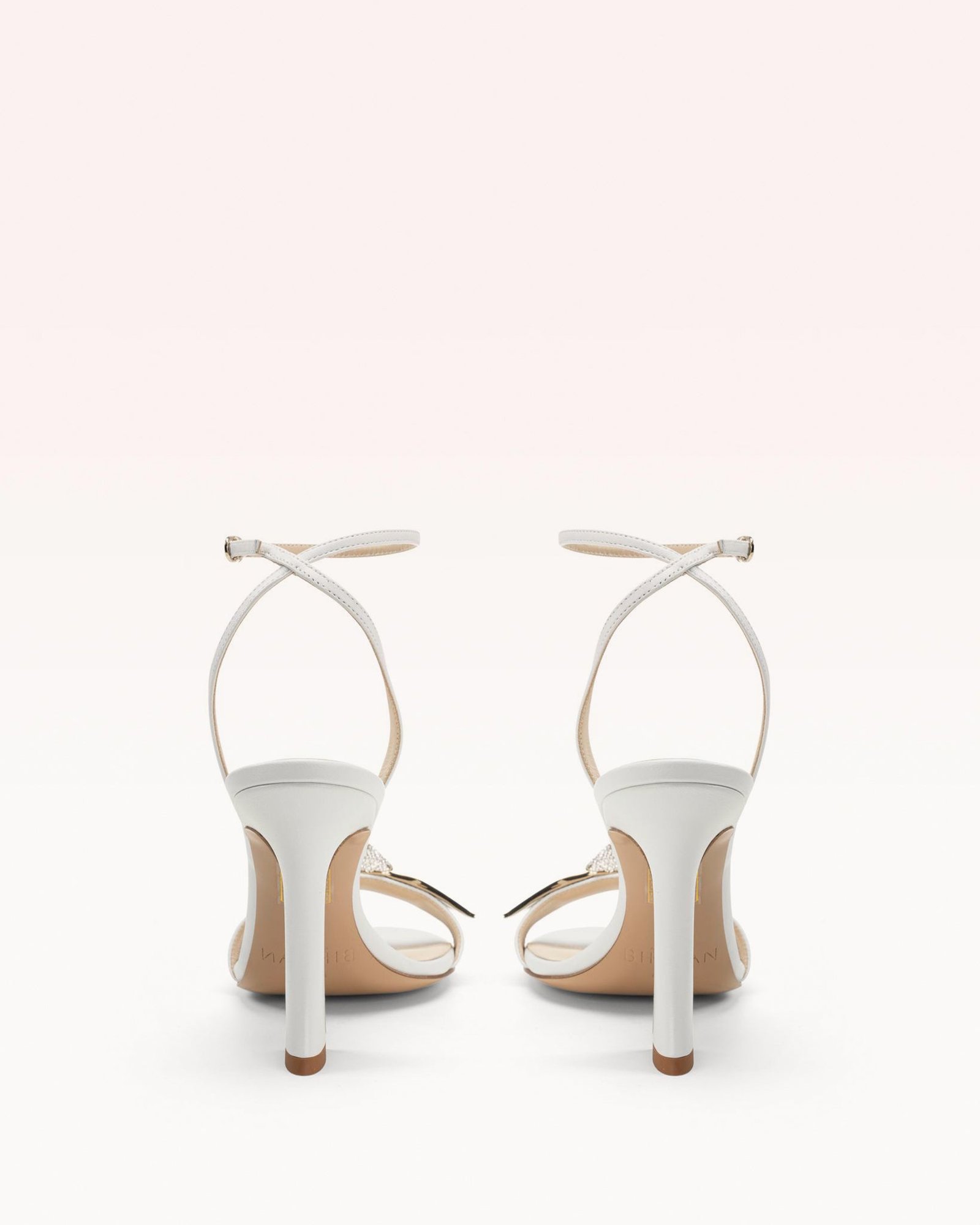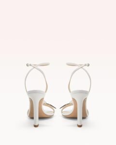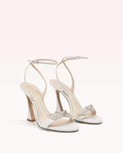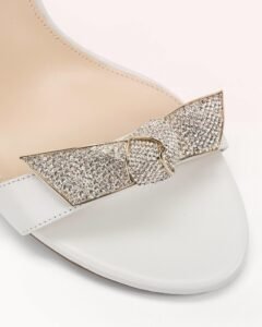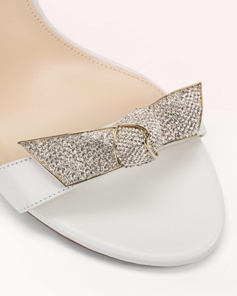 Our Clarita bows just gained two upscale versions this season: entirely made of metal and a glam version in metal adorned with Crystals. Our dazzling Clarita bow is beautifully placed over nappa leather straps. These exquisite styles come in our new showstopper bell heel. Easy to wear and a guaranteed fashion statement.